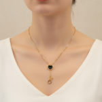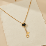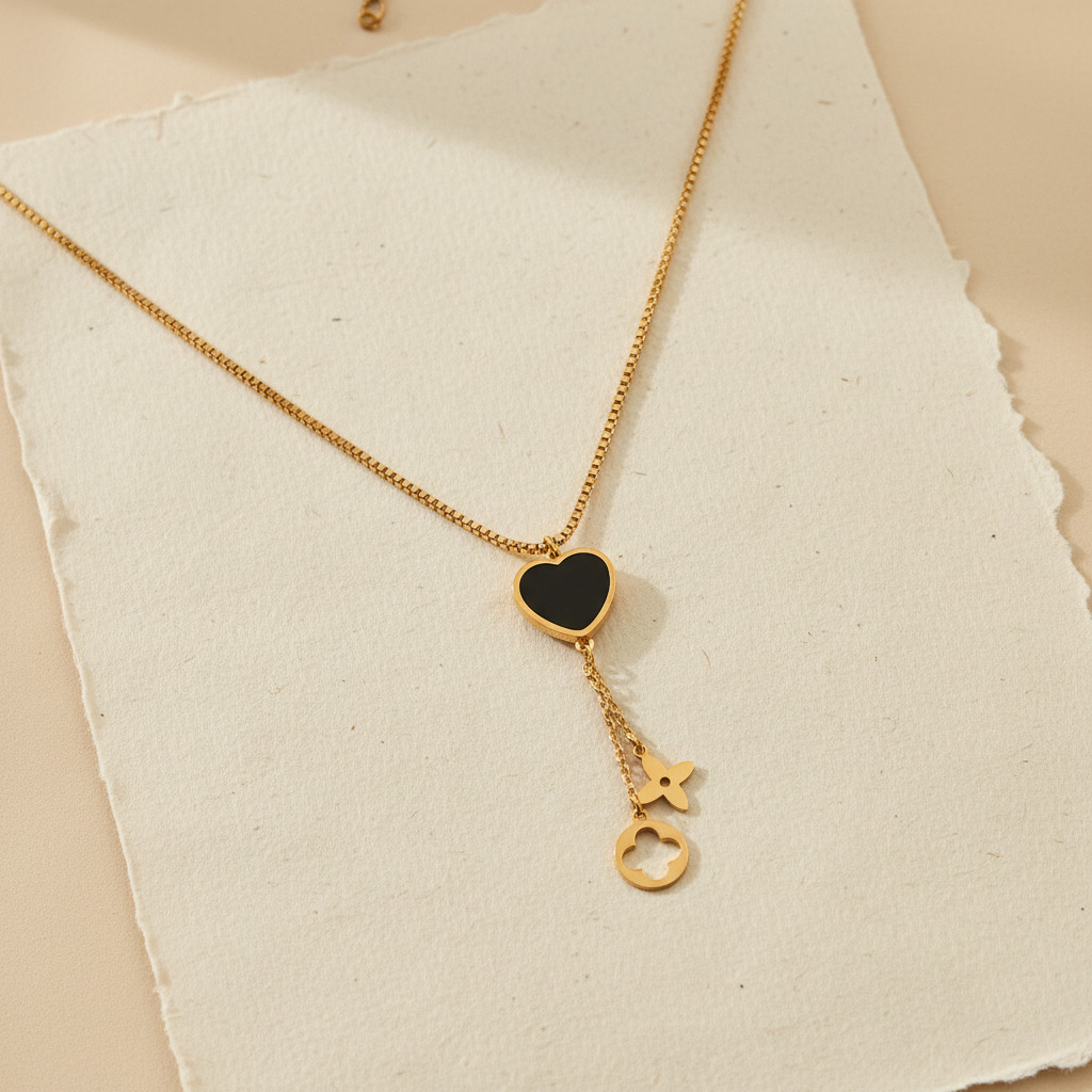 Pendant: A polished gold-framed black heart that serves as the striking focal point.