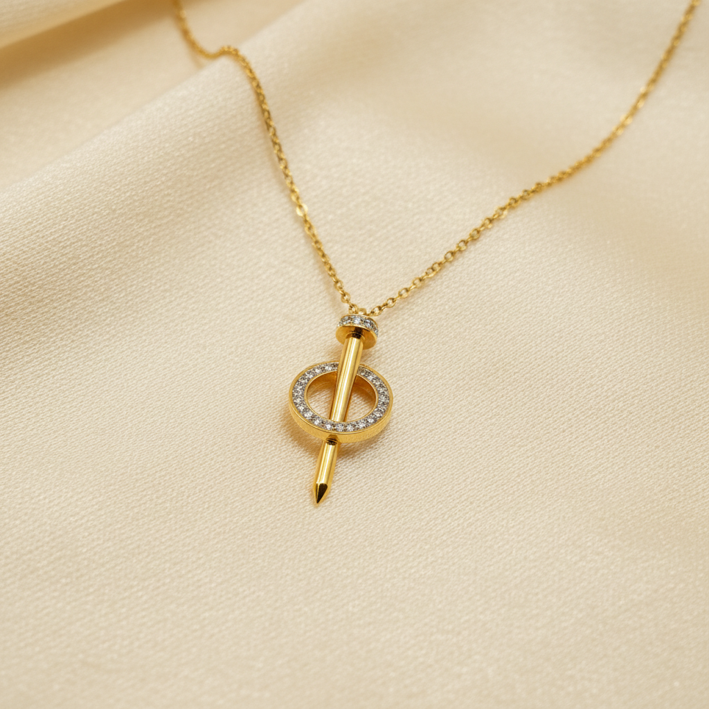 This striking necklace features a high-polish golden nail pendant that passes vertically through a shimmering circular halo.