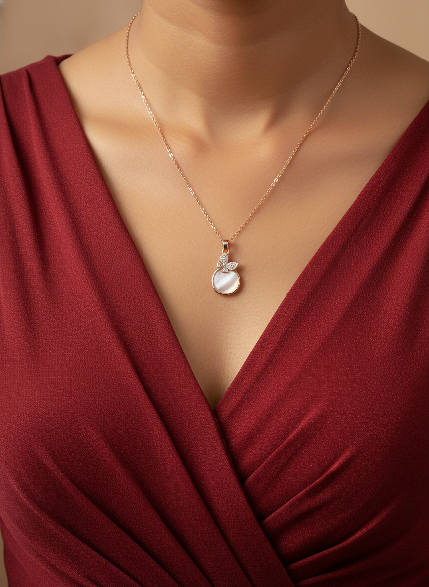 • Sparkling Butterfly Detail: A small butterfly accented with pavé-set crystals sits atop the main pendant.